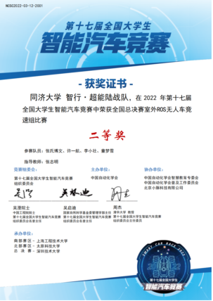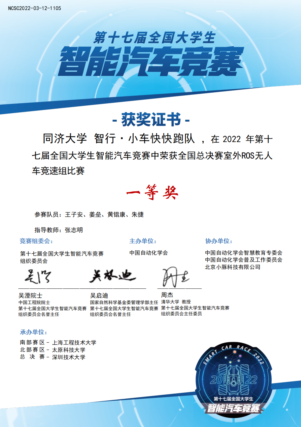 本次专项赛也是全国大学生智能车竞赛实验室的2022年度收官比赛,为此,竞赛实验室负责人张志明老师和参与辅助管理的罗翊杰、王聪聪、姚宇阳、金屹阳、杨怡、岳可等同学制定详细的参赛培训计划,王子安(计算机科学与技术)、姜垒(计算机科学与技术)、黄锴康(电子信息工程)、朱捷(通信工程)四位同学组成“智行·小车快快跑队”,张氏博文(自动化)、许一航(人工智能)、李小壮(人工智能)、童梦雪(自动化)四位同学组成“智行·超能陆战队”,参加室外ROS无人车竞速赛。受疫情防控影响,本次备赛准备时间短,同时赛题难度加大,队伍需要团结协作,在实践学习中总结相关经验和教训,继双双获得南部赛区一等奖后,再接再厉,全国总决赛中“智行·小车快快跑队”获得一等奖1项,“智行·超能陆战队”获得二等奖1项。