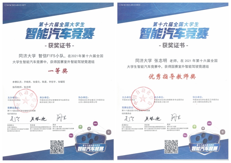 本次比赛是全国大学生智能车竞赛实验室组织参加的2021年的收官比赛,竞赛实验室负责人张志明老师和参与辅助管理的赵师兵、曾宪坤、韩子奇、冯翊、方少腾同学制定详细的参赛培训计划,选拔齐晓燕(自动化,大三)、李哲宇(自动化,大二)、张儒戈(自动化,大三)、陈晨(自动化,大三)、张曜程(人工智能,大三)五位同学组成“智信F1F5小队”参加室外智能驾驶竞速赛。受疫情防控影响,本次备赛准备时间短、难度大,队伍需要团结协作在室外场地冒着寒风、披星戴月调试车辆。备赛过程受到校本科生院、嘉定校区管委会和学院大学生创新基地等单位的大力支持,最终决赛成绩排名第十,获得全国一等奖1项。