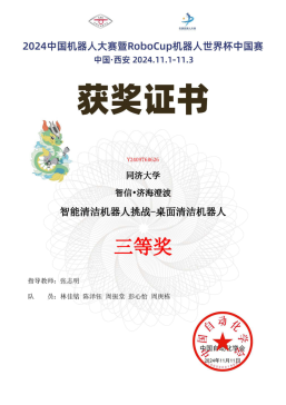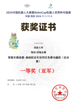 人工智能+机器人竞赛实验室三支队伍由张志明、朱劲两位老师指导并带队参赛。在双车协同任务赛电磁组赛项中,由王圣睿(队长/电子信息工程)、项卢羽成(通信工程)、曹文旭(自动化)组成的智信•济海先锋队获亚军(一等奖),张新烁(队长/自动化)、毛政珽(自动化)、王旭光(电气工程及其自动化)组成的智信•济海破晓队获得三等奖。在桌面清洁机器人赛项中,由林佳铭(队长/电气工程及其自动化)、陈泽钰(通信工程)、周振堂(自动化)、彭心怡(自动化)、周庚栋(硕研,控制科学与工程)组成的智信•济海澄波队获三等奖。