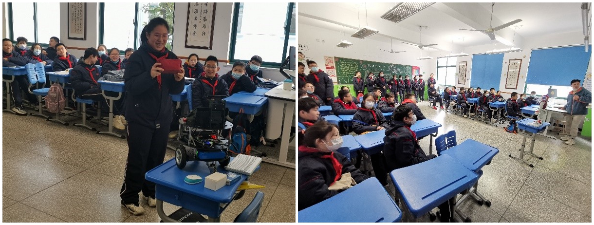 大学生创新基地师生一行七人:余有灵、徐志宇、周伟、张志明、程珺飞、刘一本、袁家遥,应邀来到杨浦区鞍山初级中学,为该校八年级140余名中学生带来了关于智能机器人的知识讲座和现场展示。