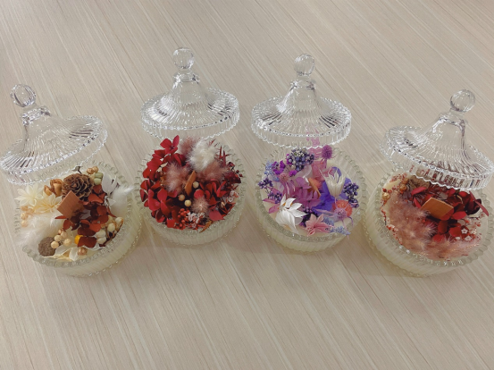 活动中,香薰师认真讲解蜡烛的分类、制作过程、使用用途,并为女教工安排制作进口大豆精油蜡烛,一边讲解一边制作。为了让做出来的香薰蜡烛更有创意、更美观,老师们在成型的蜡烛上加入各种永生花作为点缀,郁郁芬香的蜡烛搭配上浪漫色彩的永生花,让每位老师手里的作品都精彩纷呈。
